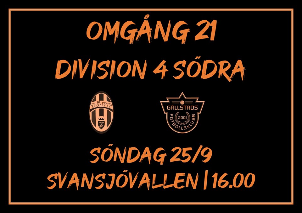 Efter gårdagens match mellan Byttorp - Fristad (2-3), kan GFK vid seger mot TÄFF säkra spel i Division 4 även kommande år. i söndags gjorde GFK en av sina bättre insatser under hösten, men man kammade ändå noll mot Skene som var effektivare och som vann med 3-2. TÄFF mötte samtidigt serieledande Göta på bortaplan och fick vända hem med 0-6 i baken, men dessförrinan har man haft en bra höst. Förra mötet lagen emellan slutade 2-2, där GFK borde stängt matchen när man ledde med 2-0 efter mål av Simon Broman och Elvin Cuni. Men TÄFF kämpade sig tillbaka och fick med sig en pinne. Referatet från vårens möte: Referat | GFK - TÄFF 2-2 (16/6) Till morgondagens match är GFK i stort sett full trupp för första gången under hösten. Ett par bortfall finns i form av Johan Ekman och Ibrahim Nazari som är iväg på resande fot, men klart mer positivt truppläge än ett par andra matcher under hösten. Tabell | Division 4 Södra Truppen mot TÄFF: 1. Jonathan Kisch 3. Anton Andersson 4. Emil Ejderhall 6. Linus Håkansson 9. Oskar Lid 10. Sebastian Forsblad 11. Elvin Cuni 15. Simon Broman 17. Rasmus Grönkvist 18. Joakim Johansson 19. Elias Andersson 22. Mattias Johansson 24. John Rosell 26. Albin Ek 27. Viktor Lid 28. Lias Gustafsson 30. Emil Svensson